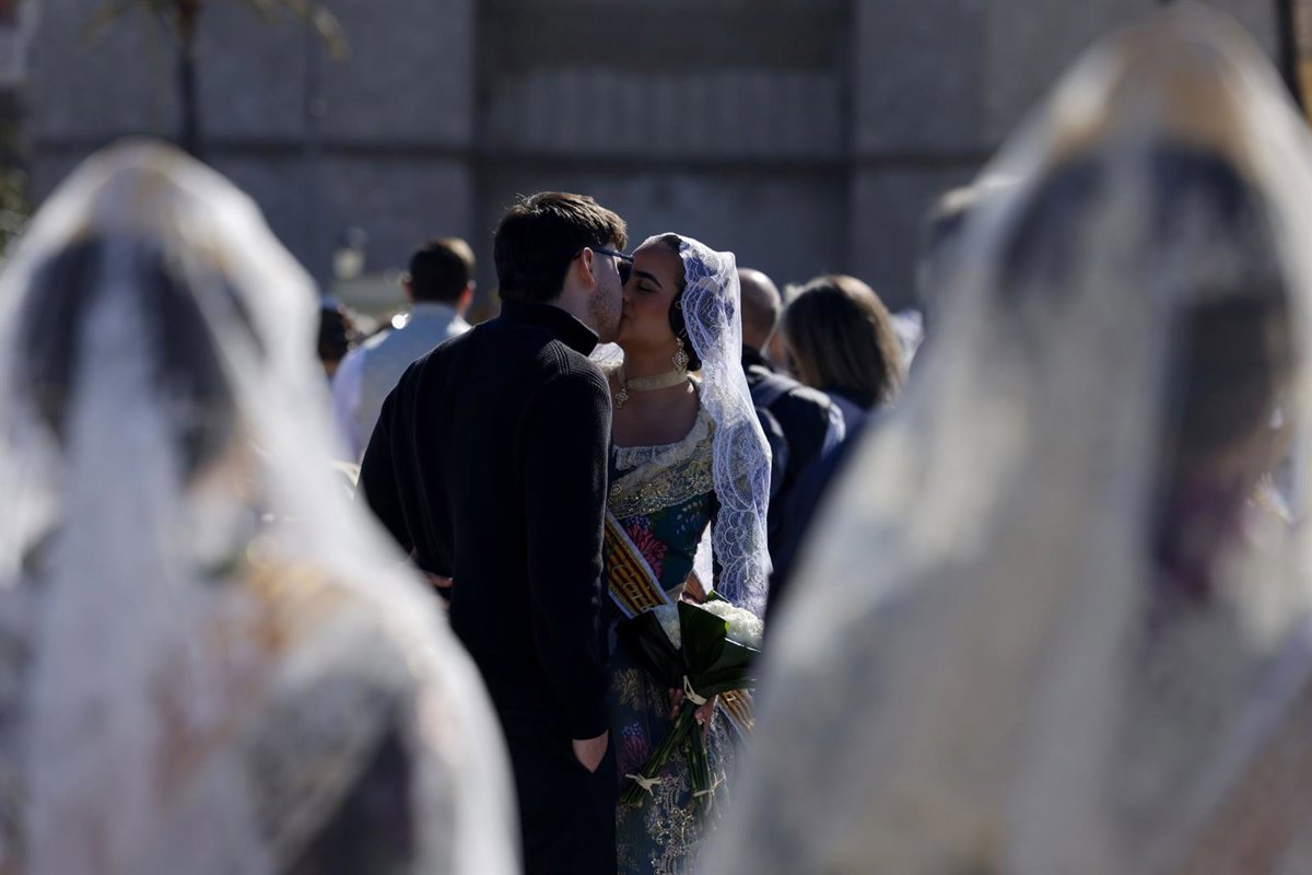 Imagen de una pareja de falleros en la Ofrenda a la Virgen de los Desamparados de 2026. - ROBER SOLSONA/EUROPA PRESS