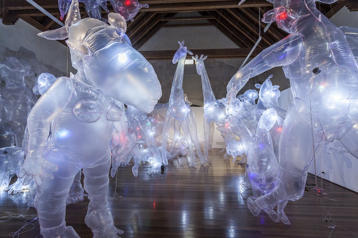 Así, diferentes humanoides, cuadrúpedos y personajes híbridos son suspendidos en el espacio de la sala en una composición aérea y en continuo movimiento, mientras otros inflables se encuentran posados en el suelo recreando escenas más terrenales y libidinosas. En esos cuerpos traslúcidos, sus motores, como corazones eléctricos, insuflan aire en su interior, marcando con sus ritmos una indescifrable sinfonía eléctrica.