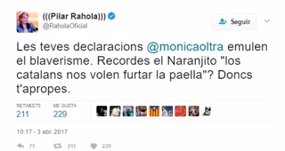 Al hilo de esas palabras, Pilar Rahola colgaba el siguiente mensaje en su cuenta de Twitter: Les teves declaracions @monicaoltra emulen el blaverisme. Recordes el Naranjito "los catalans nos volen furtar la paella"? Doncs t'apropes. (Tus declaraciones, Mónica Oltra, emulan el blaverismo. ¿Recuerdas el Naranjito 'los catalanes nos quieren robar la paella?. Pues te acercas).