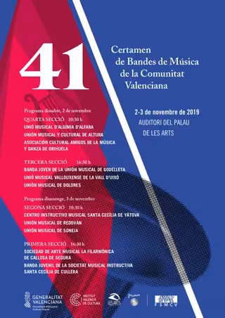 El Institut Valenci de Cultura presenta el programa completo del 41. Certamen de Bandas de Música de la Comunitat Valenciana, que en esta ocasión se llenará con las 11 bandas participantes los días 2 y 3 de noviembre el Auditori del Palau de les Arts de Valncia.