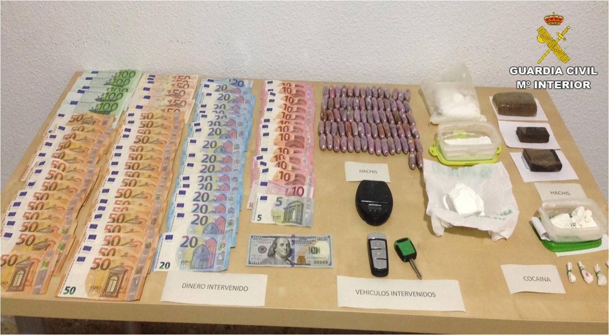 Durante la investigación, los guardias civiles realizaron dos registros domiciliarios y un registro en el bar, de donde se incautaron 50 bellotas de hachís (300 gramos), tres gramos de cocaína, diez gramos de sustancia de corte, 2.471 euros y un turismo.