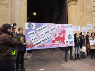 Los concentrados se han colocado a las mismas puertas del TSJCV tras una gran pancarta simulando un billete de 500 euros con el lema 'Que tornen els diners per a cooperació' (Que devuelvan el dinero para cooperación'. Entre ellos, estaba la diputada socialista Clara Tirado, el parlamentario de EUPV Ignacio Blanco, la concejala de Compromís en el Ayuntamiento de Valencia Consol Castillo o el dirigente de Intersindical Valenciana, Vicent Maurí. Asimismo, se han unido algunas personas con los chalecos rojos contra el cierre de Radio Televisión Valenciana (RTVV).