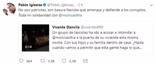 En un mensaje colgado en su cuenta de Twitter, el líder de Podemos escribe: "No son patriotas, son basura fascista que amenaza y defiende a los corruptos. Toda mi solidaridad con @monicaoltra".