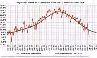 El pasado sábado, 2 de diciembre, fue el tercer día más frío de este año en la Comunitat Valenciana con una temperatura media de 5,5 grados, por debajo de los valores habituales para el final del otoño. Solo dos jornadas de 2017 han sido más frescas, las del 18 y 19 de enero que rozaron una media de 0 grados, según los datos de la Agencia Estatal de Meteorología (Aemet).