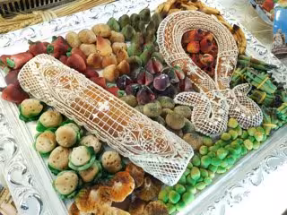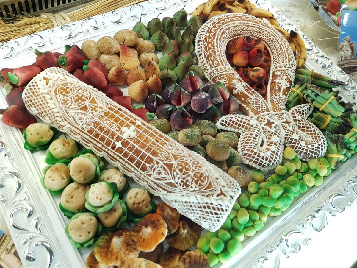 Junto a ellos se elaboraron también frutas y hortalizas de mazapán, en referencia a la fertilidad de la huerta y también a las hortalizas que los moros regalaron a la esposa de Jaume I, la reina Doña Violante de Hungría.