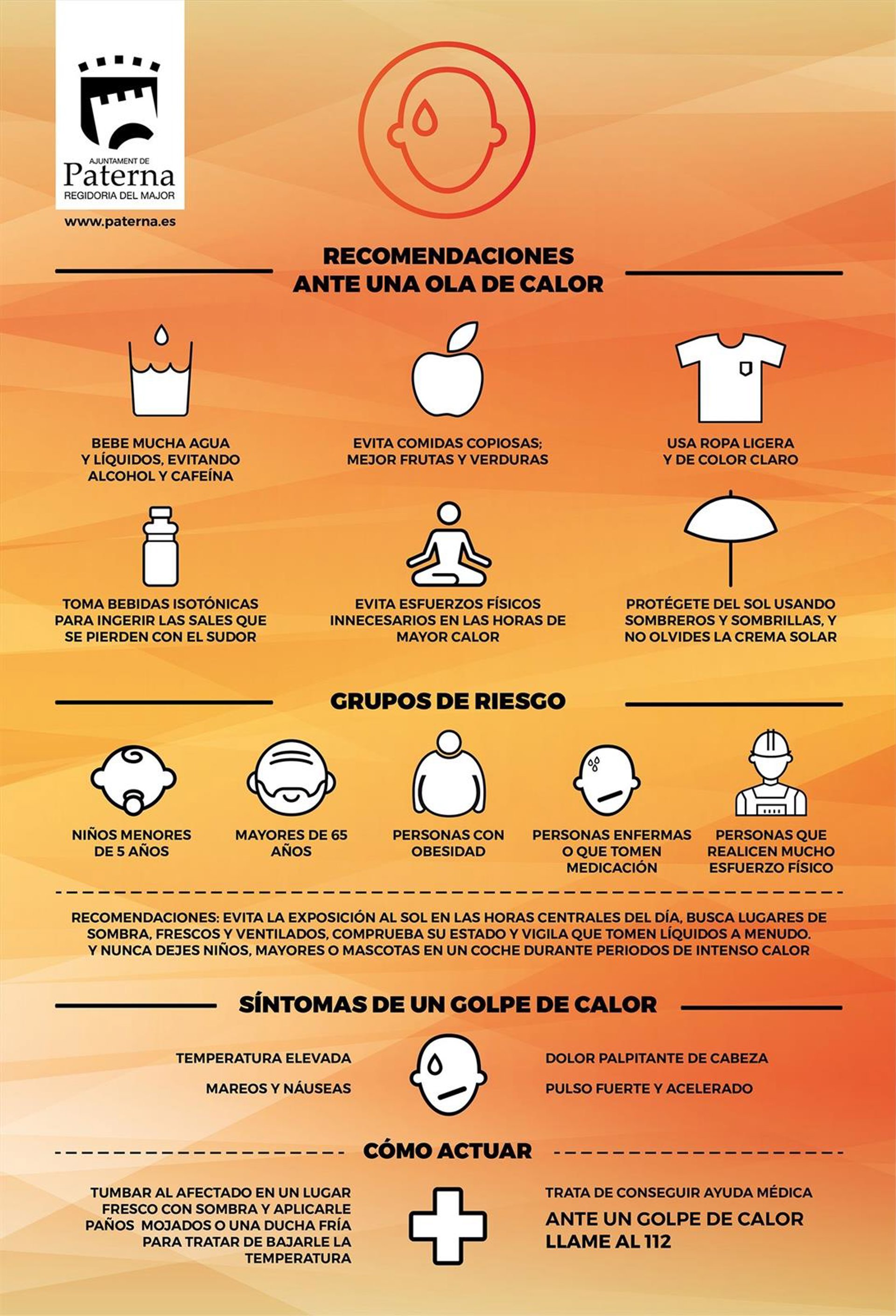 El ayuntamiento de Paterna ha activado la campaña para prevenir los efectos negativos en la salud durante las olas de calor que estará activa hasta el 30 de septiembre e incluye un apartado específico en la web municipal con un décalogo de buenas prácticas entre las que se incluye usar ropa ligera y de colores claros, evitar comidas copiosas, beber mucha agua o evitar los esfuerzos físicos y la exposición directa al sol durante las horas centrales del día.
