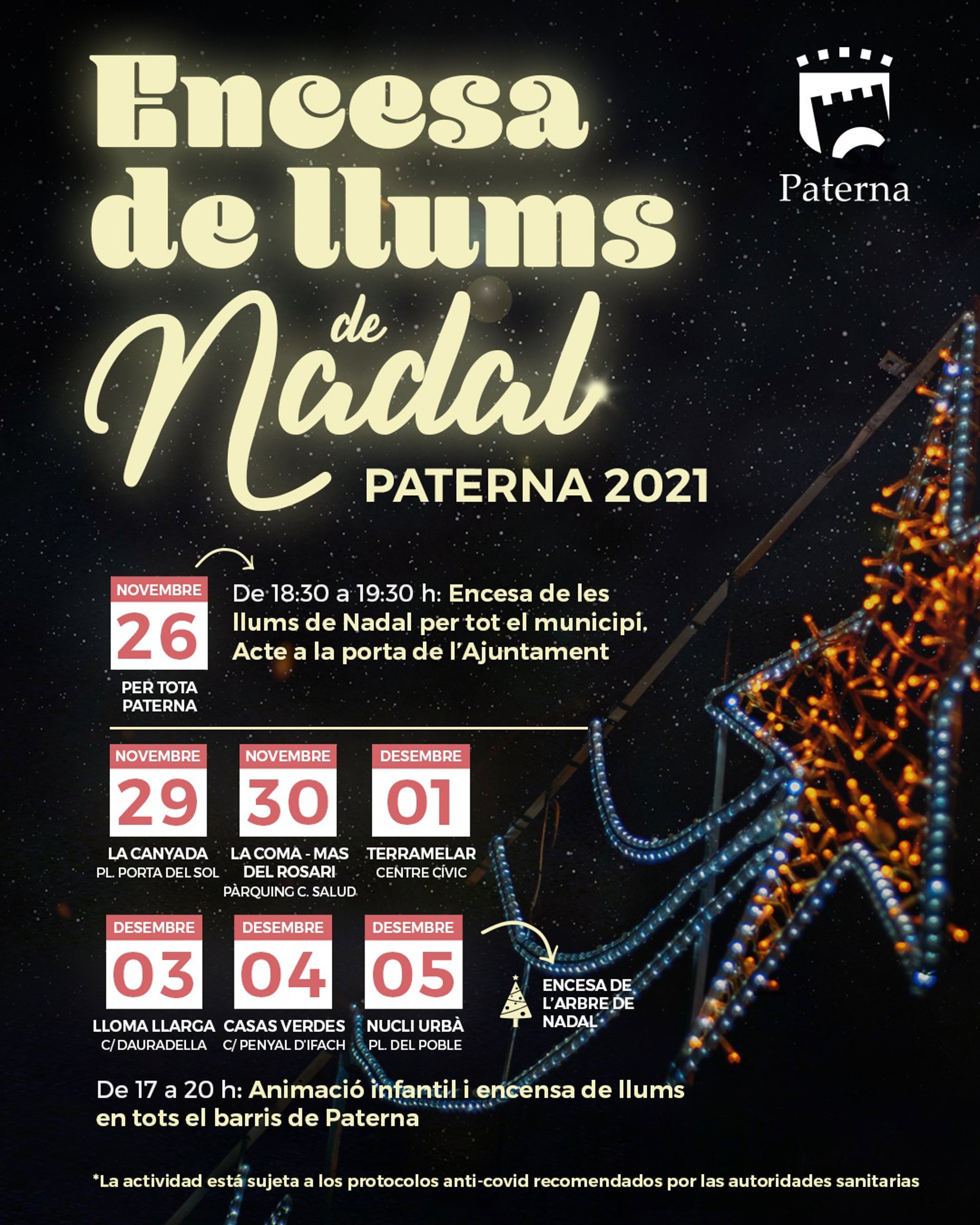 El Ayuntamiento de Paterna (Valencia) dará la bienvenida a la Navidad con el tradicional encendido de las luces navideñas, que tendrá lugar en todos los barrios de la ciudad acompañado de música, photocall, animación y espectáculos infantiles.