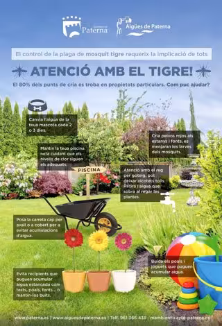 Entre las advertencias del Servicio de Control de Plagas de Ayuntamiento de Paterna, destacan cambiar el agua de las mascotas cada dos o tres días o evitar el agua estancada en platos de macetas, ceniceros o cualquier tipo de recipientes que pueda acumularla.
