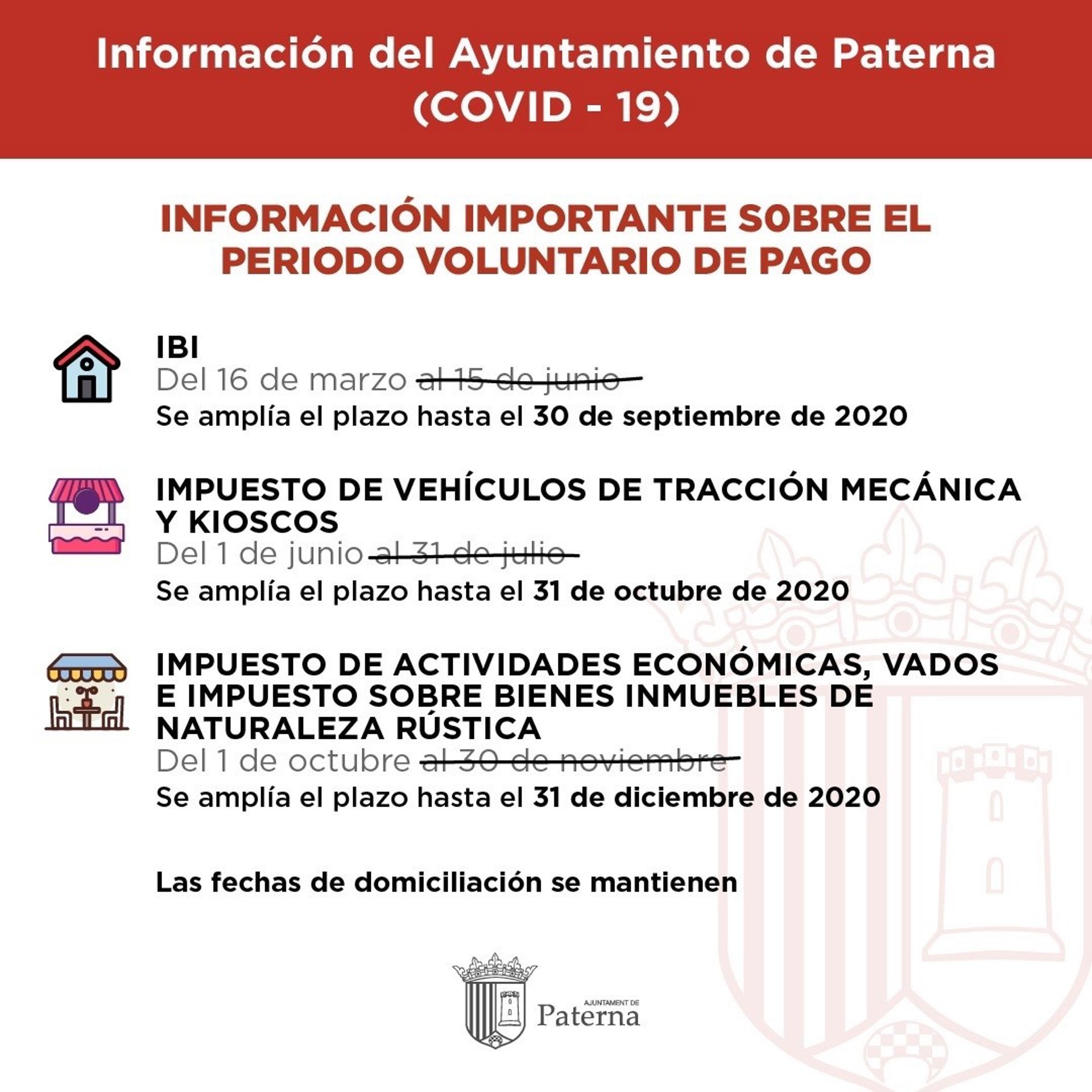 El Ayuntamiento de Paterna (Valencia) ha decidido volver a modificar el calendario del contribuyente para retrasar aún más el periodo voluntario de pago de los principales impuestos municipales con el objetivo de reducir la presión fiscal de las familias mientras se afronta la crisis sanitaria ocasionada por coronavirus.