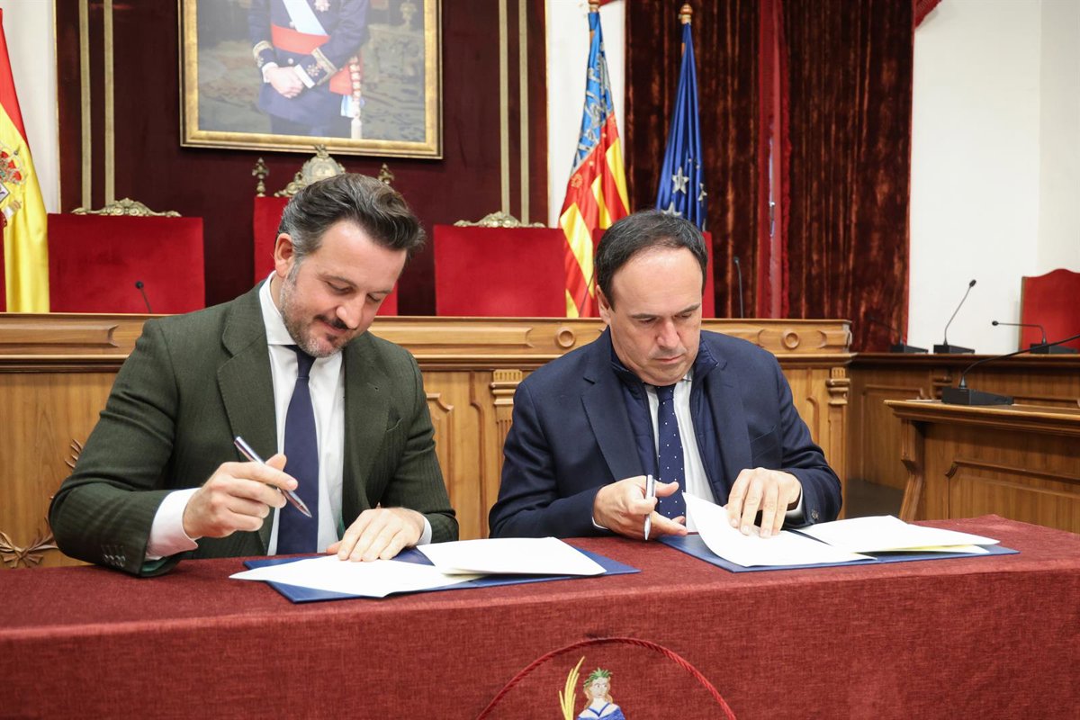 El 'president' de la Generalitat, Juanfran Pérez Llorca (d), y el alcalde de Elche (Alicante), Pablo Ruz (i), durante la firma del convenio entre ambas administraciones para la implantación del E-TRAM - GVA