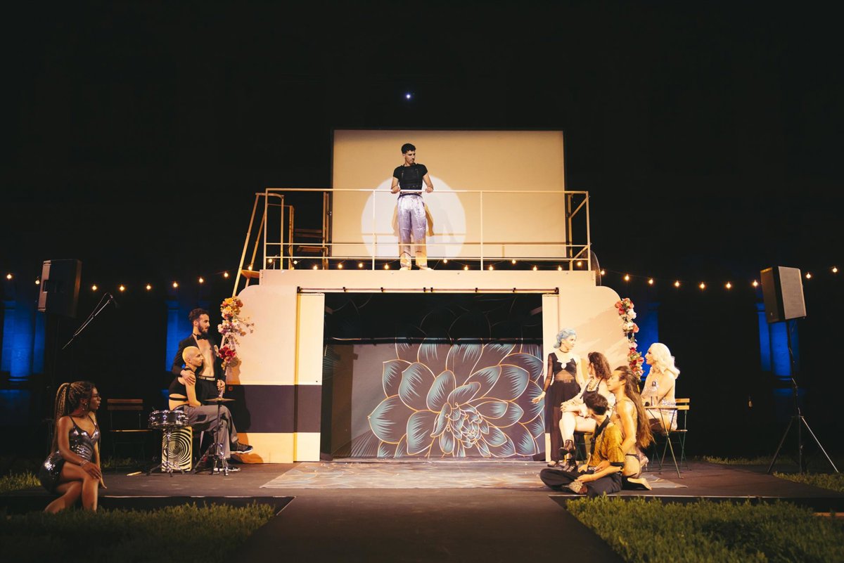 Diferentes lenguajes expresivos conviven con el teatro y la proyección de audiovisuales en una puesta en escena aderezada por un vestuario ecléctico, con texturas, colores y estilos tan diversos como la belleza de las flores que representa cada uno de los personajes-intérpretes.