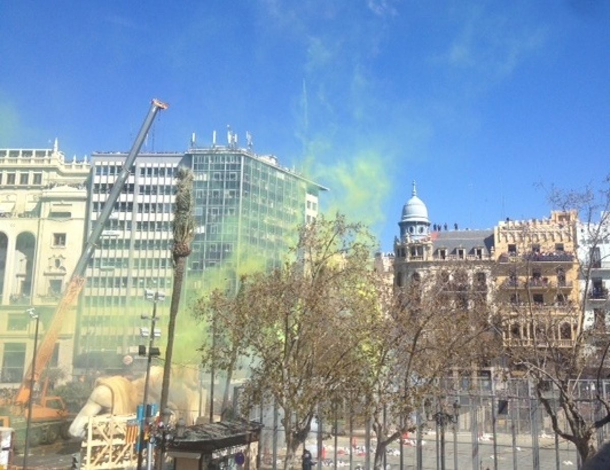 La pirotecnia Vulcano S.L. --dirigida por un valenciano que se tuvo que trasladar a Madrid-- se ha estrenado este lunes en la Plaza del Ayuntamiento de Valencia con una mascletà 100 por cien valenciana, en la que se ha podido ver dibujada en el aire la Senyera, y con un final atronador y diversificado.