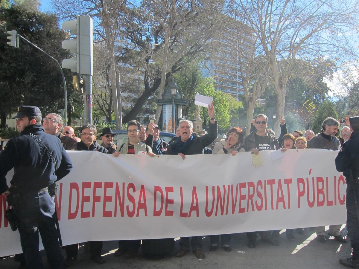 Los integrantes de la plataforma se han apostado sobre las 10.30 horas para esperar la llegada de autoridades al acto de presentación del informe 'Contribuciones Económicas y Sociales de las Universidades Públicas Valencianas', al que han asistido el presidente de la Generalitat, Alberto Fabra, representantes de partidos de la oposición y los cinco recortes de las universidades públicas de la Comunitat.
