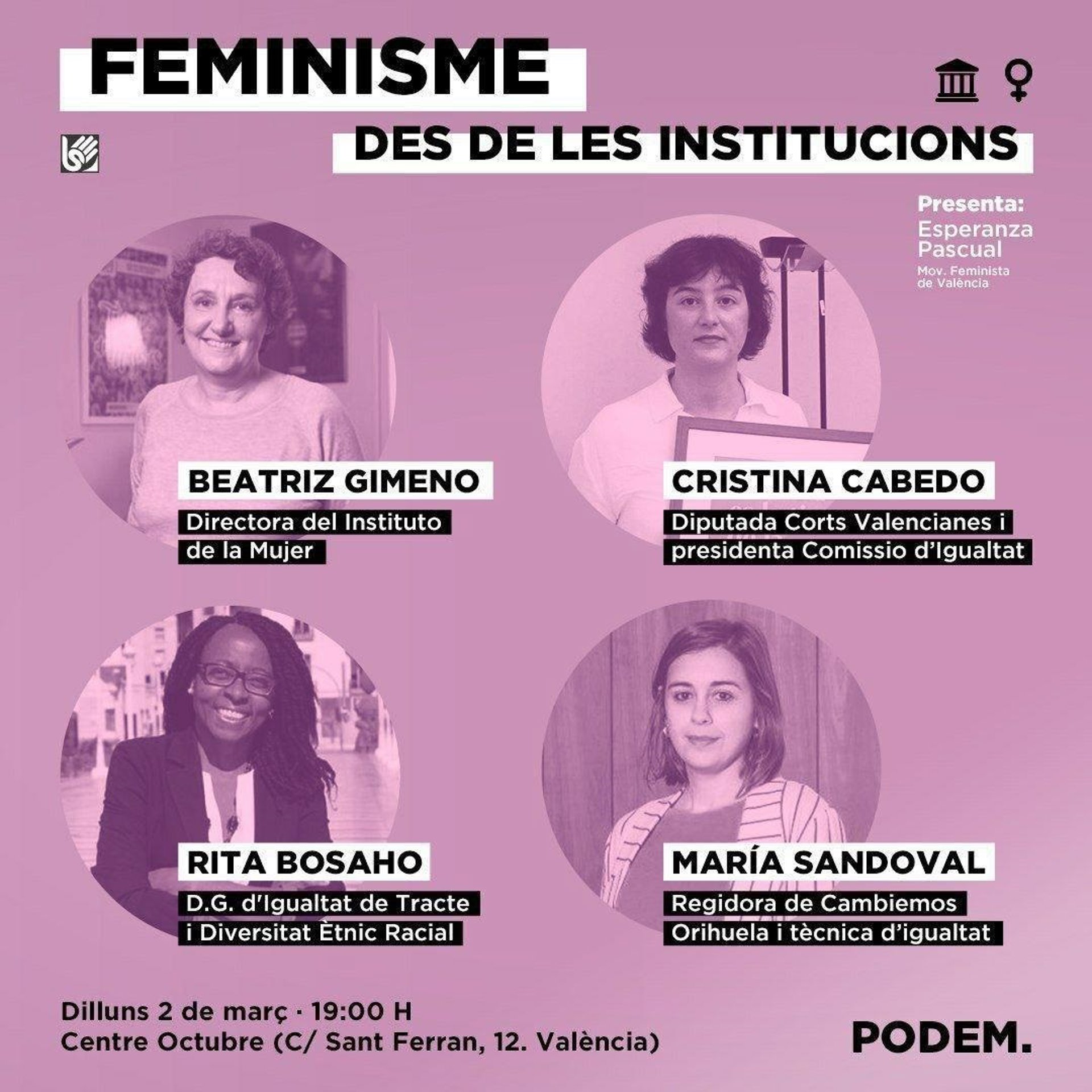 "El feminismo desde las instituciones" será el asunto del acto público organizado por el grupo de trabajo de Feminismos de Podem Valncia, que tendrá lugar en el Centre Octubre. Intervendrán diversas mujeres de Podemos con responsabilidad institucional, entre ellas la Directora del Instituto de la Mujer, Beatriz Gimeno.