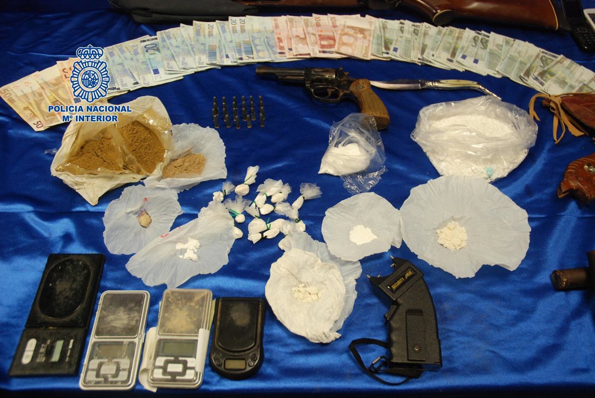 En la operación, los agentes realizaron cinco registros domiciliarios en tres puntos de la ciudad y se incautaron de un revólver calibre 22 y 23 cartuchos, 515 gramos de sustancia estupefaciente preparada para vender en dosis de cocaína y 82 gramos de sustancia preparada para vender en dosis de heroína, una pistola eléctrica Táser, cuatro balanzas, una prensa, detectores de billetes falsos, teléfonos móviles, útiles para confeccionar papelinas y un vehículo de alta gama.