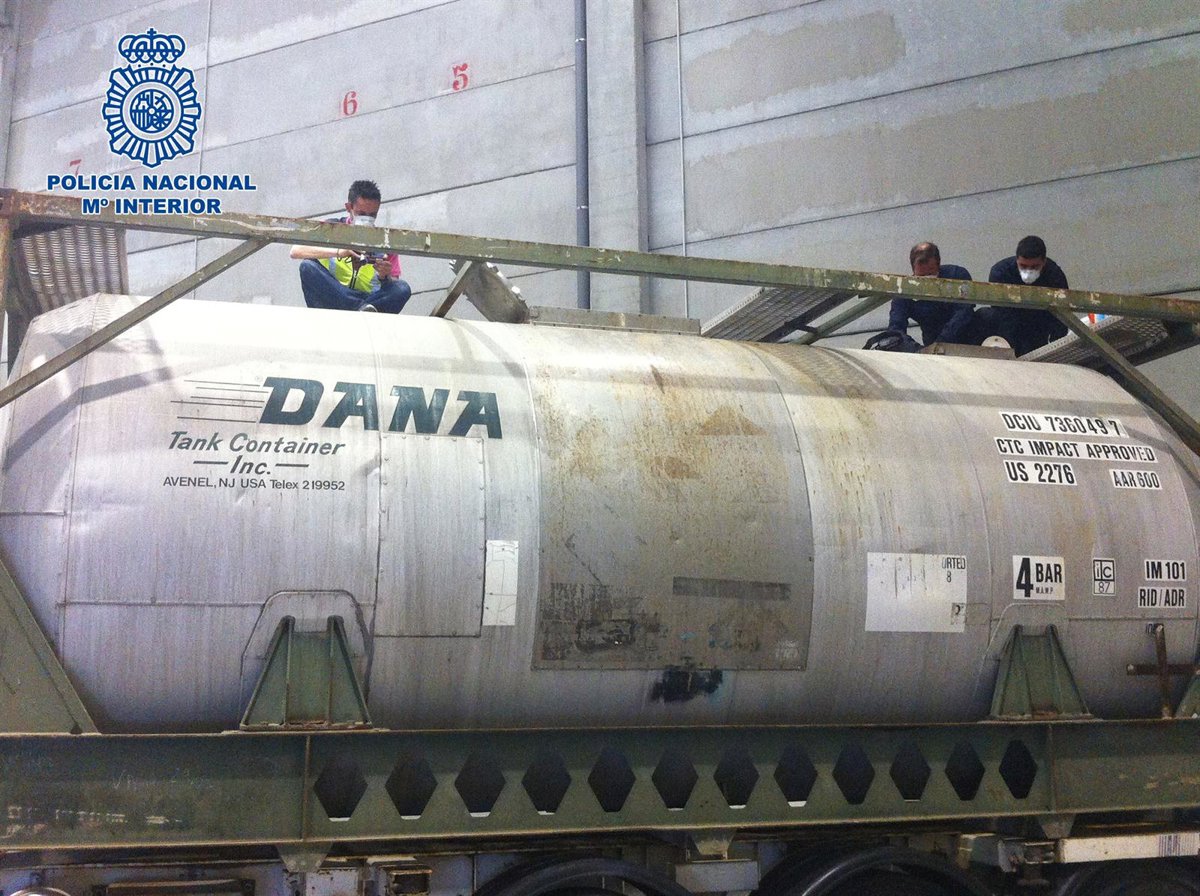 Los investigadores localizaron la vuelta de un contenedor que podría contener estupefacientes, por lo que controlaron su recorrido. La cisterna arribó al puerto de Valencia y desde allí viajó en tren al Centro Logístico del Abroñigal (Madrid), desde donde fue trasladado en camión hasta una nave sita en la localidad barcelonesa de Sabadell. En ese lugar se detuvo a dos integrantes de la organización que recibieron el envío.