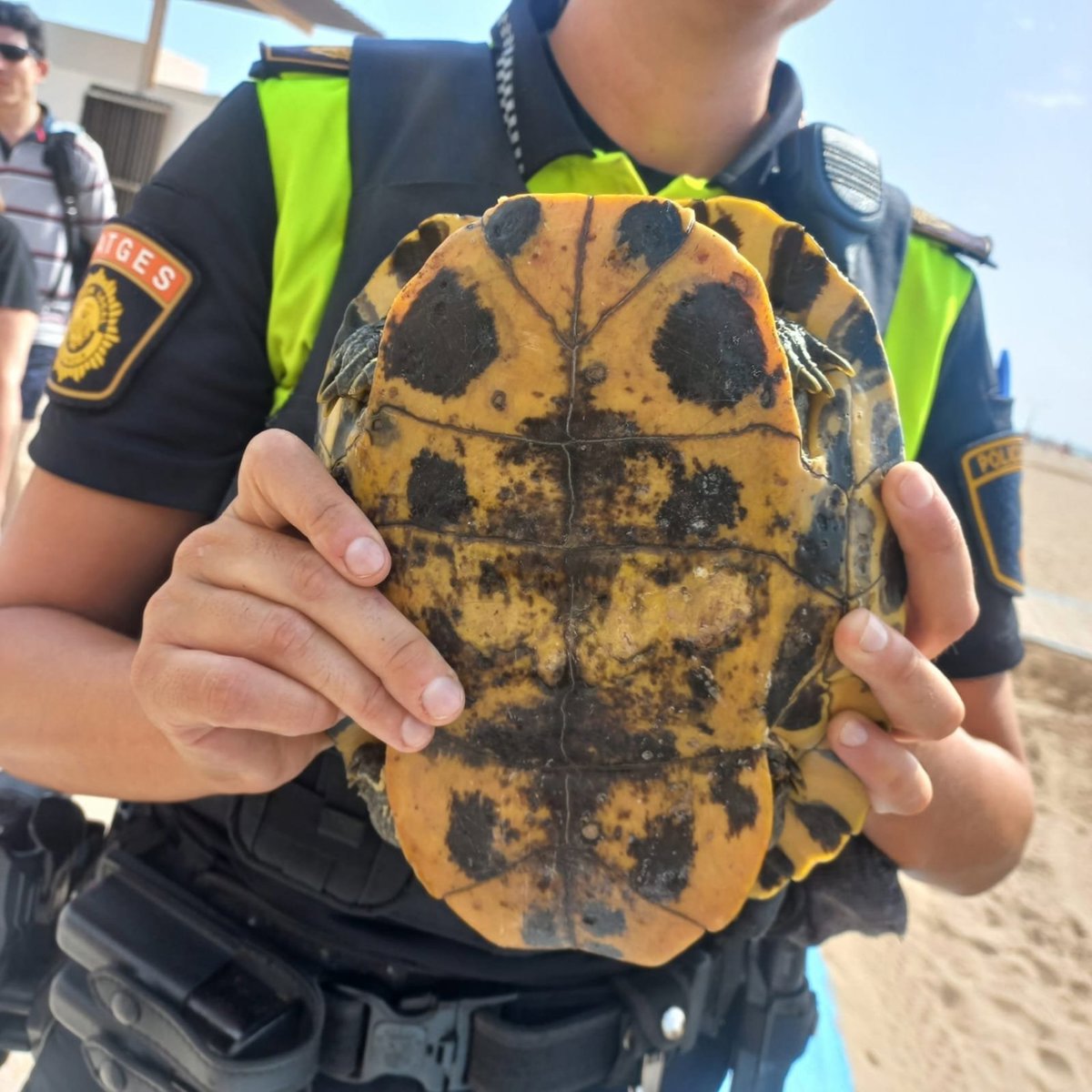 Los hechos courrieron a media mañana de este pasado martes cuando los agentes de la Unidad de Playas observaron a un hombre salir del agua con una tortuga en los brazos. La presencia del animal, de unos 30 centímetros de tamaño, llamó la atención de la unidad policial, ya que no es una especie habitual en nuestras aguas.