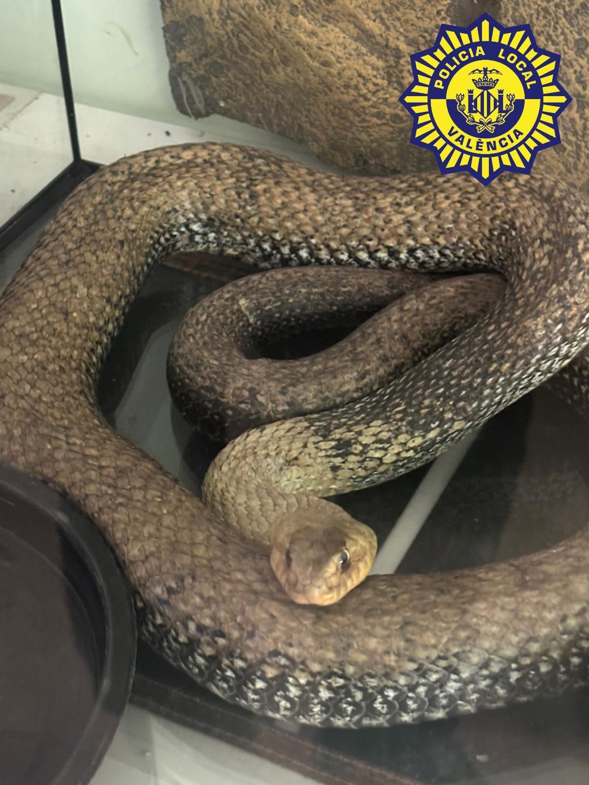 Agentes de la Policía Local de València ha localizado este sábado una culebra bastarda, o de Montpellier, de tres metros en el motor de un coche en la calle Botánico de la ciudad.