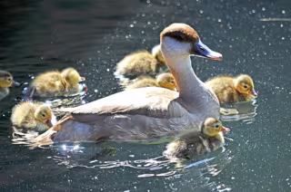 No muy lejos, en las rías de la sabana contemplamos a varios patitos siguiendo a su progenitora. En este caso la especie es el pato colorado (Netta rufina), una anátida a medio camino entre los patos buceadores y los de superficie.
