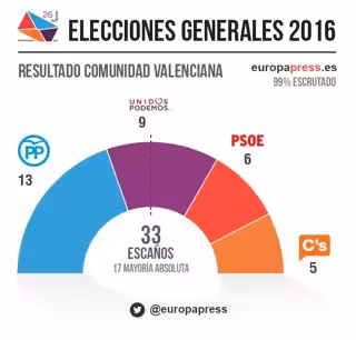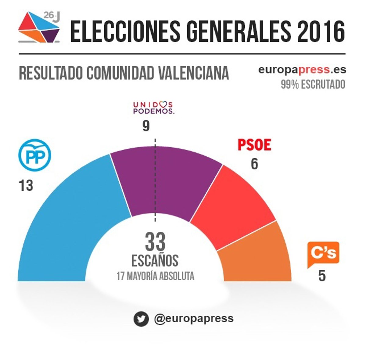 El Partido Popular ha ganado las elecciones generales de este 26 de junio en la Comunitat Valenciana al recabar unos 79.000 votos más y supera los 917.000, que se han traducido en una subida de dos escaños: pasa de los 11 de diciembre de 2015 a los 13 de 2006, al quedarse con el diputado extra que ha ganado Valencia por población e incorporar otro en Alicante.