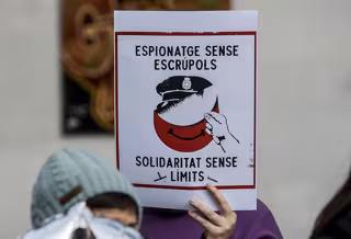 Una mujer sujeta un cartel que hace referencia al espionaje, durante una rueda de prensa de miembros de los movimientos vecinales CSOA l'Horta, Cuidem Benimaclet y Alerta Solidria. - Rober Solsona - Europa Press