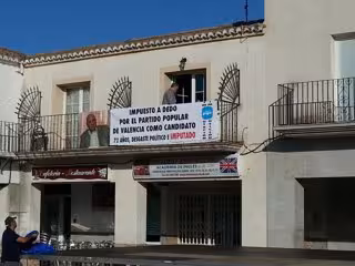 En un balcón de la Plaza del Ayuntamiento de la localidad, que este miércoles 8 de abril celebra el día de la segregación de Paterna, se ha colgado un cartel criticando esta decisión, junto con una foto del alcalde: 'Impuesto por el PP de Valencia como candidato. 72 años, desgaste político e imputado. Imputación. Imposición'.