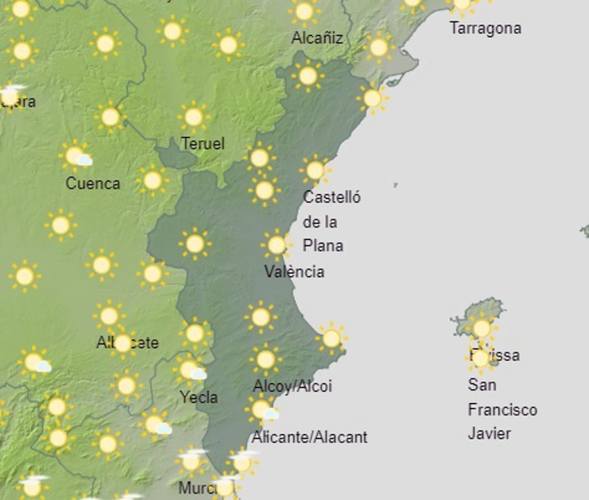 Finalmente, en Alicante, se esperan máximas de 35 en Orihuela, 32 en Alcoi y Elx, y 30 en Alicante y Dénia. Las mínimas serán de 16 en Alcoi, 20 en Elx, Alicante y Orihuela, y 22 en Dénia.
