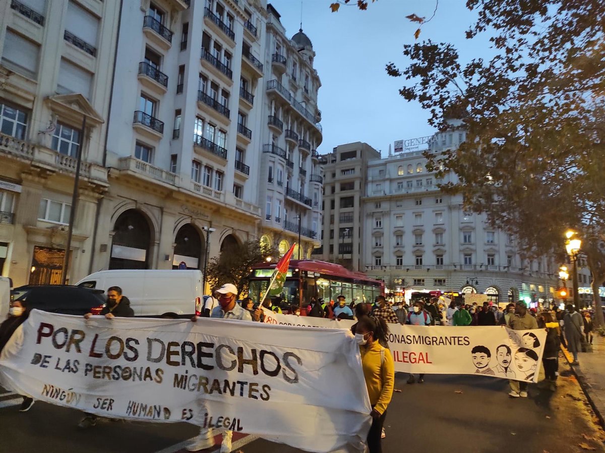 El acto ha tenido lugar este 19 de diciembre a las 17.30 horas en la plaza del Ayuntamiento de Valncia en el marco de la conmemoración del Día Internacional del Migrante el pasado viernes 18. Posteriormente, los asistentes han organizado una marcha alrededor de la plaza y han portado pancartas con mensajes como 'Por los derechos de las personas migrantes', 'No es caridad, es justicia social' o 'Prefiero un emigrante sin papeles a un político muy español son vergüenza'.