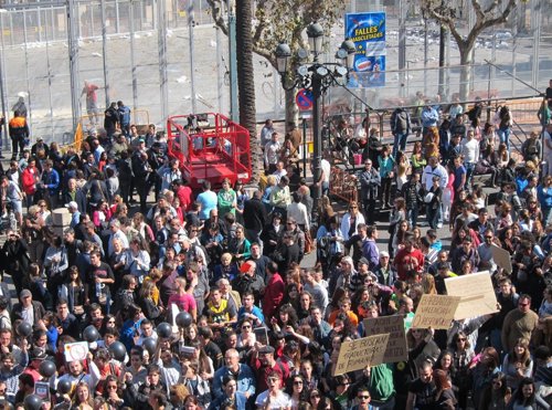 Las protestas de estudiantes y diferentes organizaciones sociales contra los recortes se han hecho escuchar este jueves en la primera 'mascletà' de las Fallas de 2012. Entre el numeroso público que llenaba la Plaza del Ayuntamiento de Valencia se han podido ver grupos de ciudadanos que pitaban, mostraban pancartas, globos negros y tarjetas rojas para reclamar servicios sociales públicos, igualdad, justicia y medidas contra la corrupción.