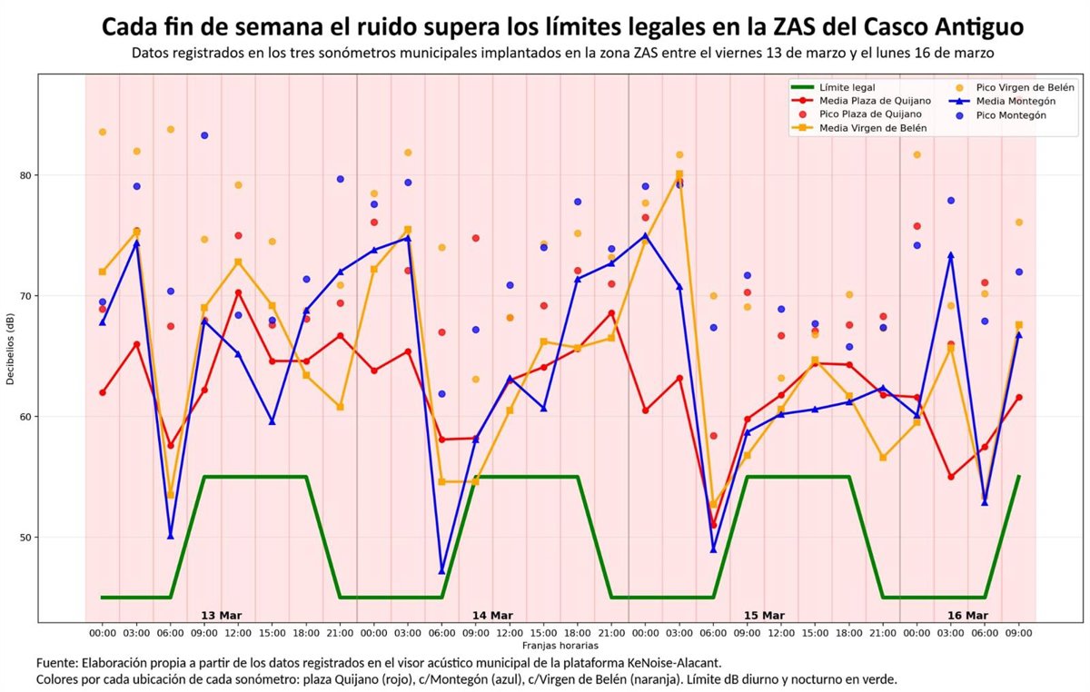 El PSPV del Ayuntamiento de Alicante ha alertado de que los sonómetros del consistorio "registran cada fin de semana niveles de ruido por encima de lo permitido en todos los puntos del Casco Antiguo", protegido como zona acústicamente saturada (ZAS), y que estos "constatan que se alcanzan picos de hasta 80 decibelios, casi el doble de lo permitido por la ordenanza municipal".