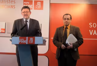 El secretario general del PSPV, Ximo Puig, y el portavoz de Economía del grupo socialista en las Corts y vicesecretario de área del partido, Julián López, han presentado en rueda de prensa el 'Informe sobre el impacto económico de la corrupción en la Comunitat Valenciana'.