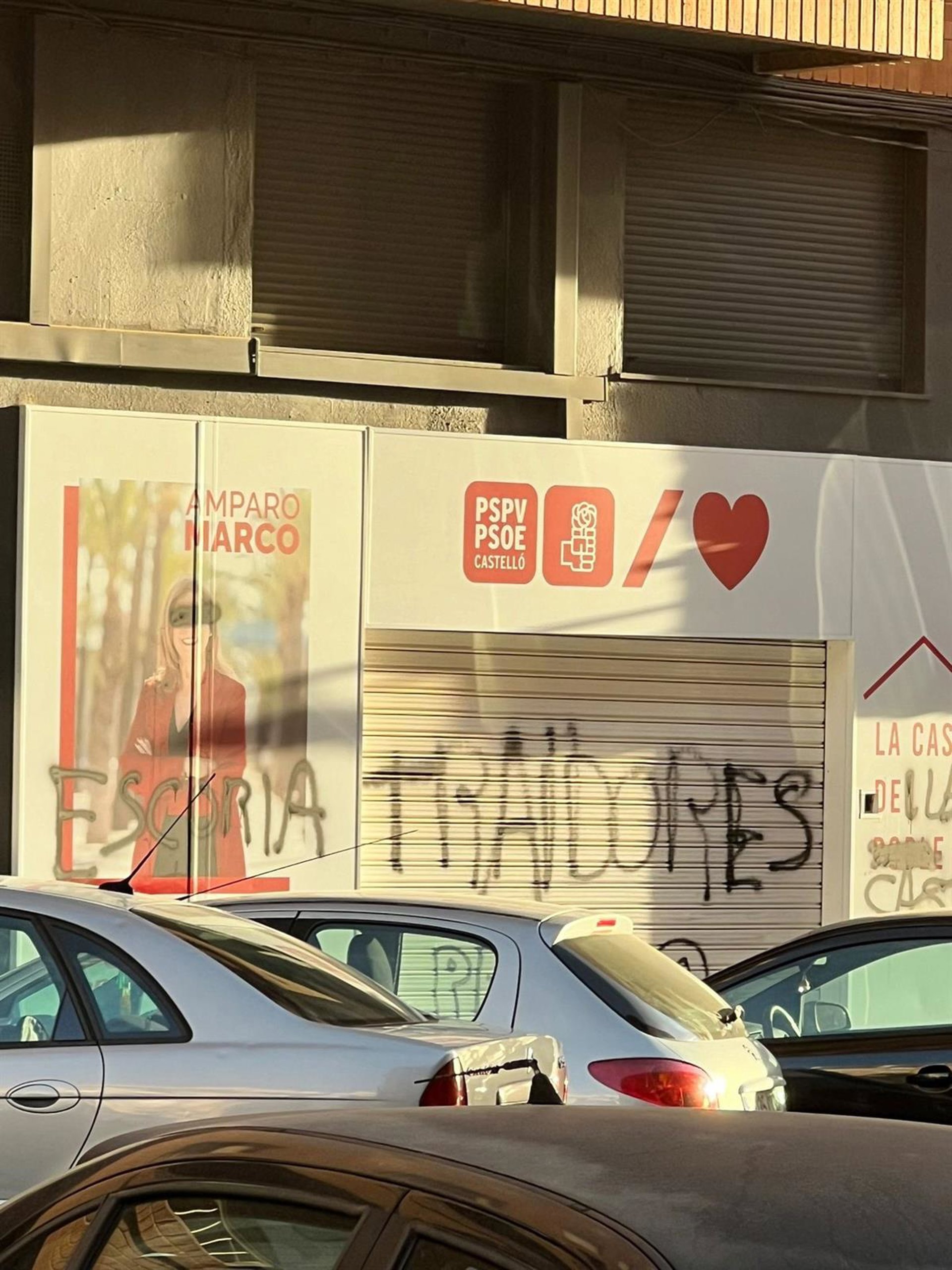 La Ejecutiva del PSPV de Castellón ha denunciado la aparición de "pintadas fascistas", en las que se pueden leer las palabras 'traidores' y 'escoria', en la sede provincial durante la pasada madrugada. "Este mensaje cargado de aversión nos remonta a las épocas oscuras del terrorismo", han advertido los socialistas.
