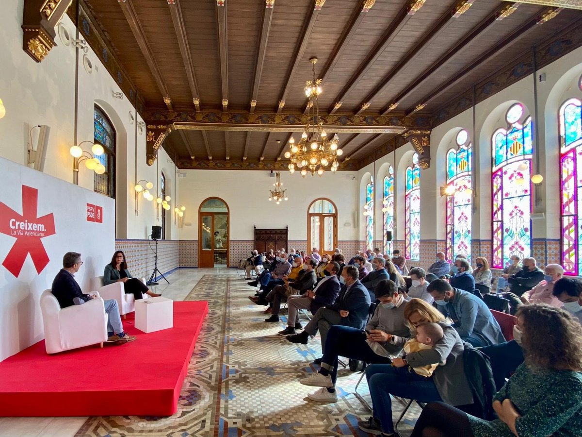 Los dirigentes socialistas, en el acto de debate sobre las enmiendas que ha presentado la militancia de la ciudad de València a la ponencia marco del congreso socialista, celebrado este sábado en el Palacio de la Exposición de València, han reivindicado al PSPV-PSOE como "el único partido que garantiza crecer en sostenibilidad, empleo e igualdad".
