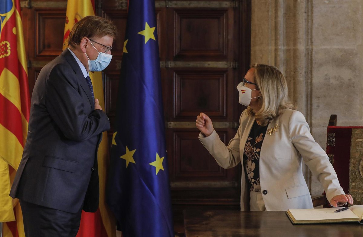 El presidente de la Generalitat, Ximo Puig y la vicepresidenta primera del Gobierno y ministra de Asuntos Económicos y Transformación Digital, Nadia Calviño, antes de una reunión, en el Palau de la Generalitat de Valencia, a 9 de septiembre de 2021. - Rober Solsona - Europa Press