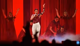 13 May 2023, United Kingdom, Liverpool: Blanca Paloma (C) from Spain sings "Eaea" at the final of the 67th Eurovision Song Contest (ESC) at the M&S Bank Arena. - Peter Kneffel/Dpa
