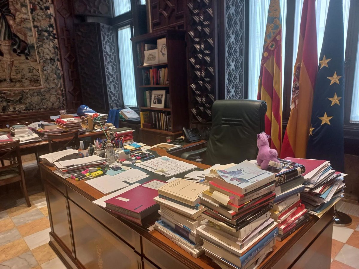 La mesa del despacho de Puig está repleta de libros, documentos y, entre otros objetos, el caballito morado de peluche que le regaló una niña ucraniana de 6 años refugiada en Alicante.