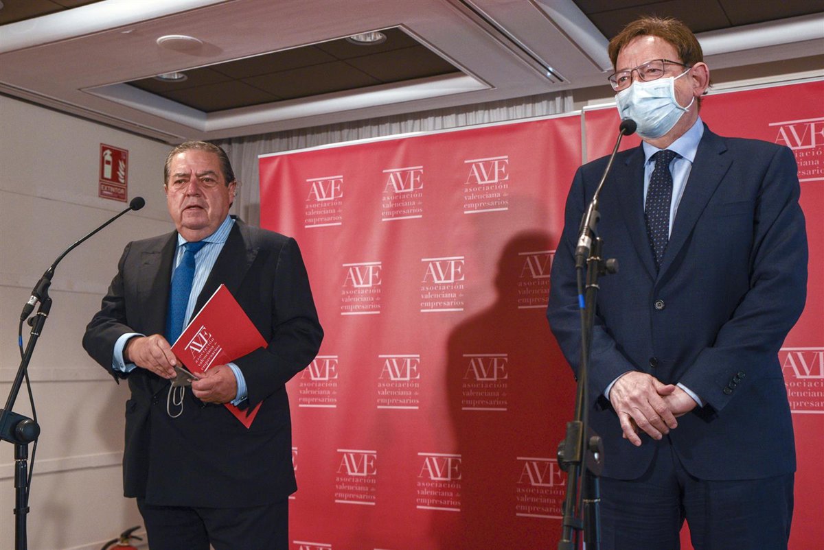 El vicepresidente de la Fundación Premios Jaime I, Vicente Boluda (i); y el president de la Generalitat, Ximo Puig, intervienen en el almuerzo-coloquio organizado por la Asociación Valenciana de Empresarios (AVE), a 14 de junio de 2021, en Valencia, Com - Jorge Gil - Europa Press