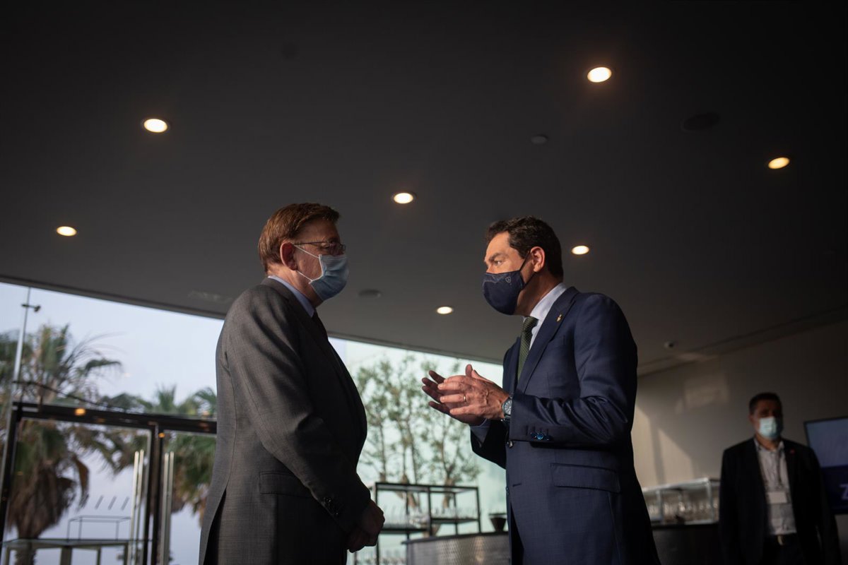 Archivo - El presidente de la Junta de Andalucía, Juan Manuel Moreno Bonilla (d), habla con el president de la Generalitat Valenciana, Ximo Puig, en una imagen de archivo - David Zorrakino - Europa Press - Archivo