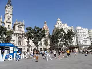 La plaza del Ayuntamiento de Valncia ha acogido este lunes un flashmob con motivo de la primera parada del Punto Móvil de Información Turística, iniciativa que se pone en marcha por tercer año consecutivo y que permite llegar a zonas con afluencia de visitantes durante estos meses, como la Ciutat de les Arts i les Cincies, espacios como el Saler o el Palmar, o eventos de la ciudad, como la Feria Habitat o La Mostra de Valncia.