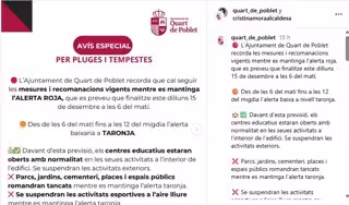 Una de las publicaciones del Ayuntamiento de Quart por la alerta roja - AYUNTAMIENTO DE QUART DE POBLET