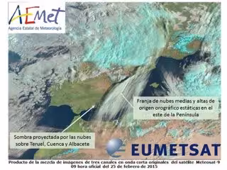 Además, a las 9.00 horas las nubes sobre la Comunitat Valenciana extendían una sombra de más de 50 km sobre provincias limítrofes. La nubosidad de hoy son nubes medias-altas formadas por ascenso forzado del flujo de aire perpendicular a cadenas prelitorales mediterráneas.