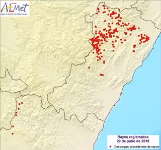La mayoría de rayos se registraron en el interior norte de la provincia de Castellón, donde las tormentas tuvieron una intensidad fuerte.