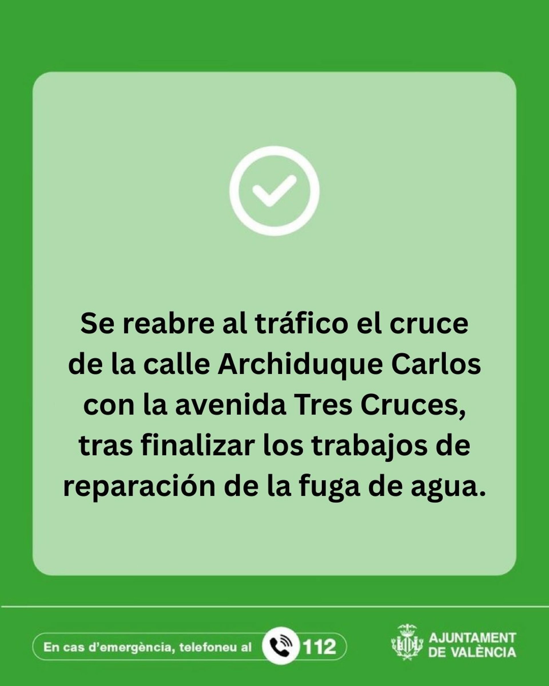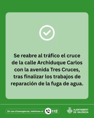 El cruce de la calle Archiduque Carlos con la avenida Tres Cruces de València ha reabierto al tráfico este sábado tras finalizar los trabajos de reparación de la fuga de agua procedente de una tubería.