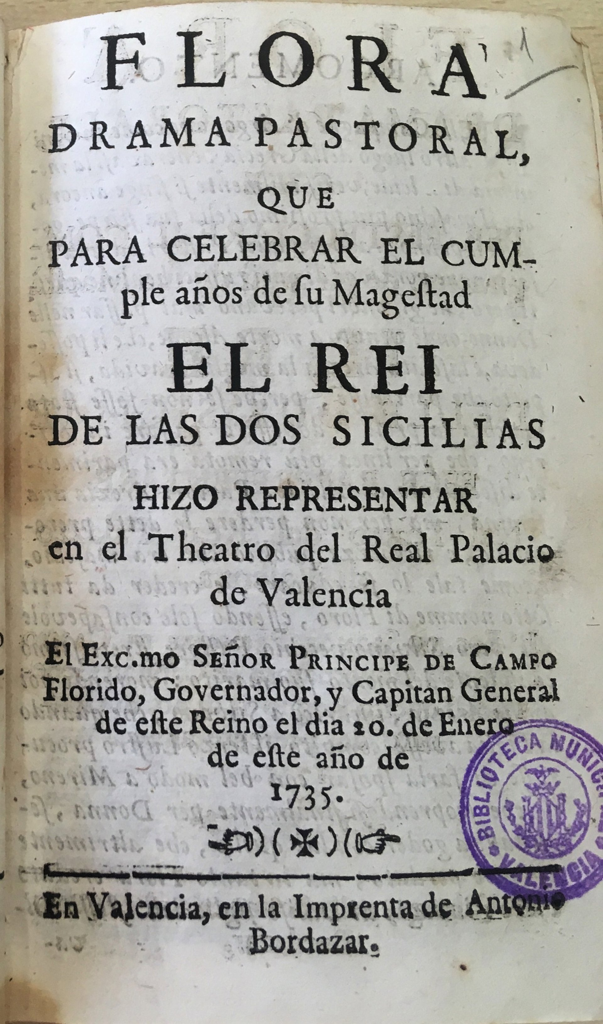El "drama pastoral" 'Flora' fue interpretado el 20 de enero de 1735 en el teatro del antiguo Palacio Real de Valncia, con ocasión del 19 cumpleaños de Carlos de Borbón, que ostentaba el título de Rey de las Dos Sicilias en ese momento y se convertiría en futuro Carlos III.