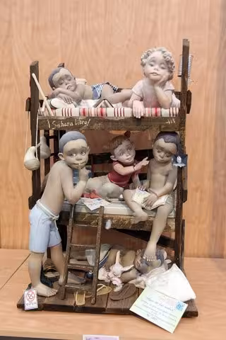 La obra del artista fallero Pedro Rodríguez y titulada 'Hijos de las nubes', que se salvará de las llamas el próximo martes 19 de marzo, muestra a un grupo de seis niños saharauis tristes en unas literas mientras se preparan para dormir. En una de las traviesas de una de las camas se puede leer 'Sáhara libre' ante la actitud triste de los niños.