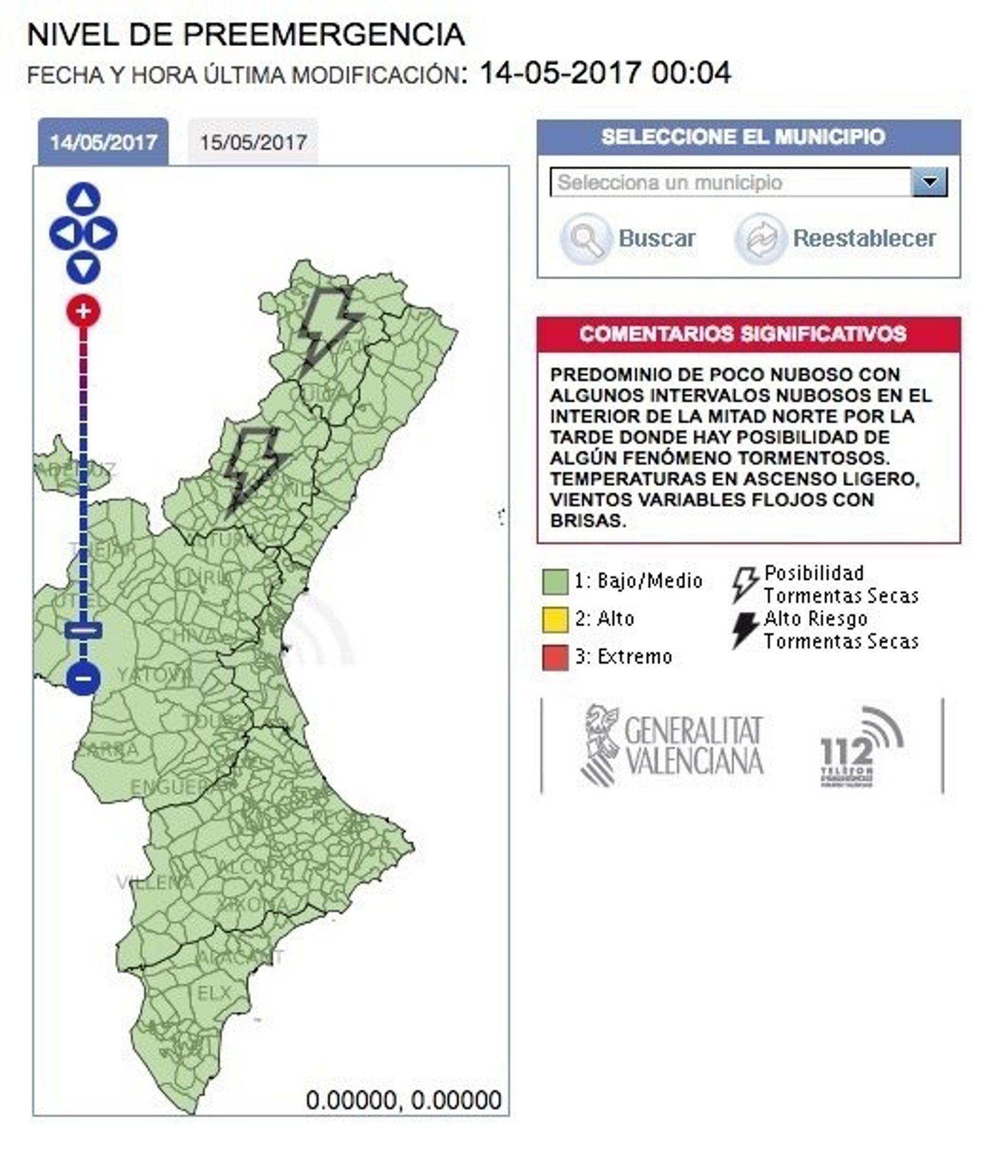 El Centro de Coordinación de Emergencias de la Generalitat Valenciana ha rebajado para este domingo la alerta de incendios en la Comunitat a nivel verde (riesgo bajo o medio), después del peligro alto de la pasada jornada. Las temperaturas se mantendrán sin grandes cambios, salvo las máximas del interior que ascenderán, con posibilidad de chubascos aislados en el interior de la provincia de Castellón.