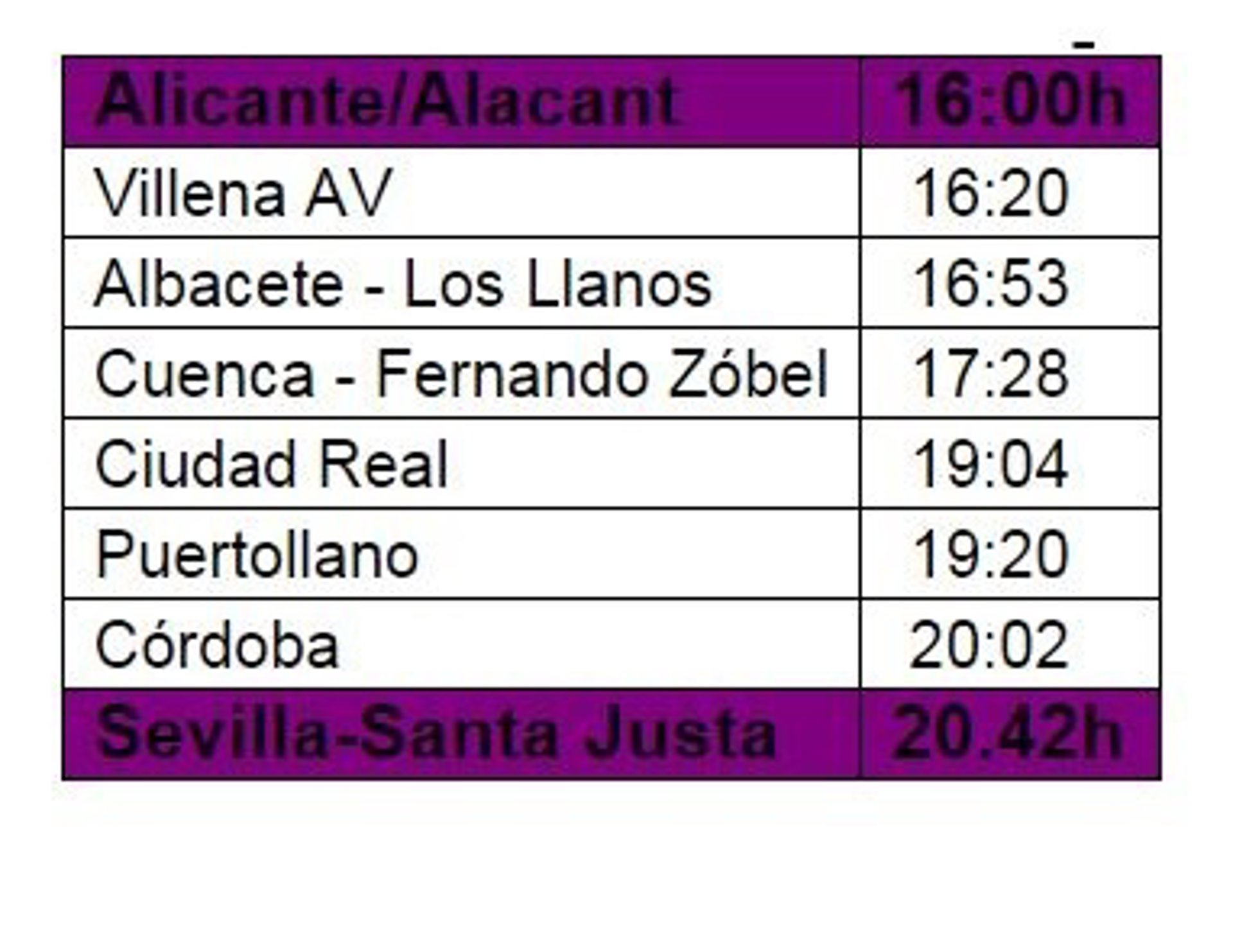 Desde Sevilla, saldrán a las 9.10 horas y desde Alicante a las 16.00 horas, con un tiempo de viaje en ambos casos de cuatro horas 40 minutos. Además de las paradas intermedias, Renfe ha informado, este martes en un comunicado, que prevé que tengan la posibilidad de enlazar con Cádiz y Málaga mediante los respectivos transbordos en Sevilla y Córdoba.