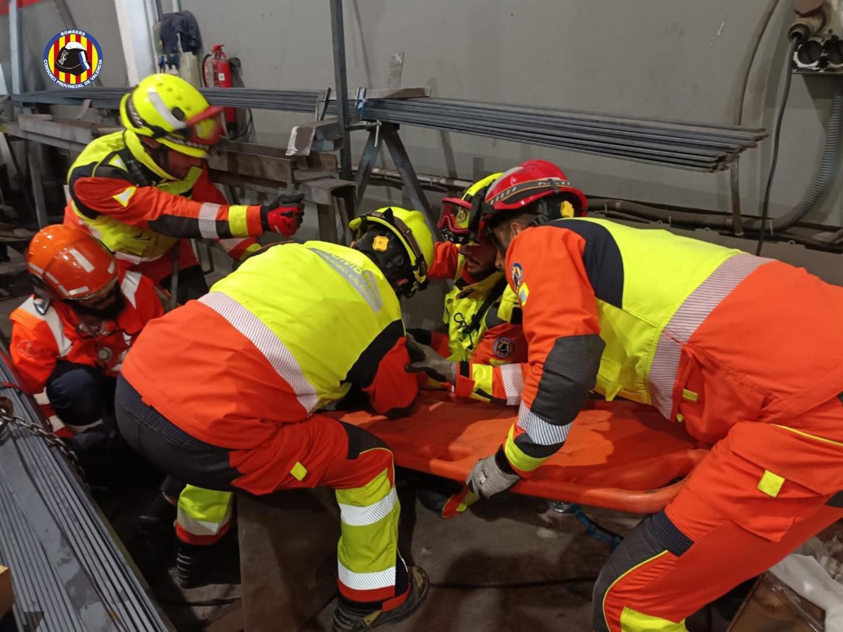 Efectivos del Consorcio Provincial de Bomberos de Valencia han rescatado en la mañana de este miércoles a un operario que había quedado atrapado por la pierna bajo una carga de perfiles metálicos.