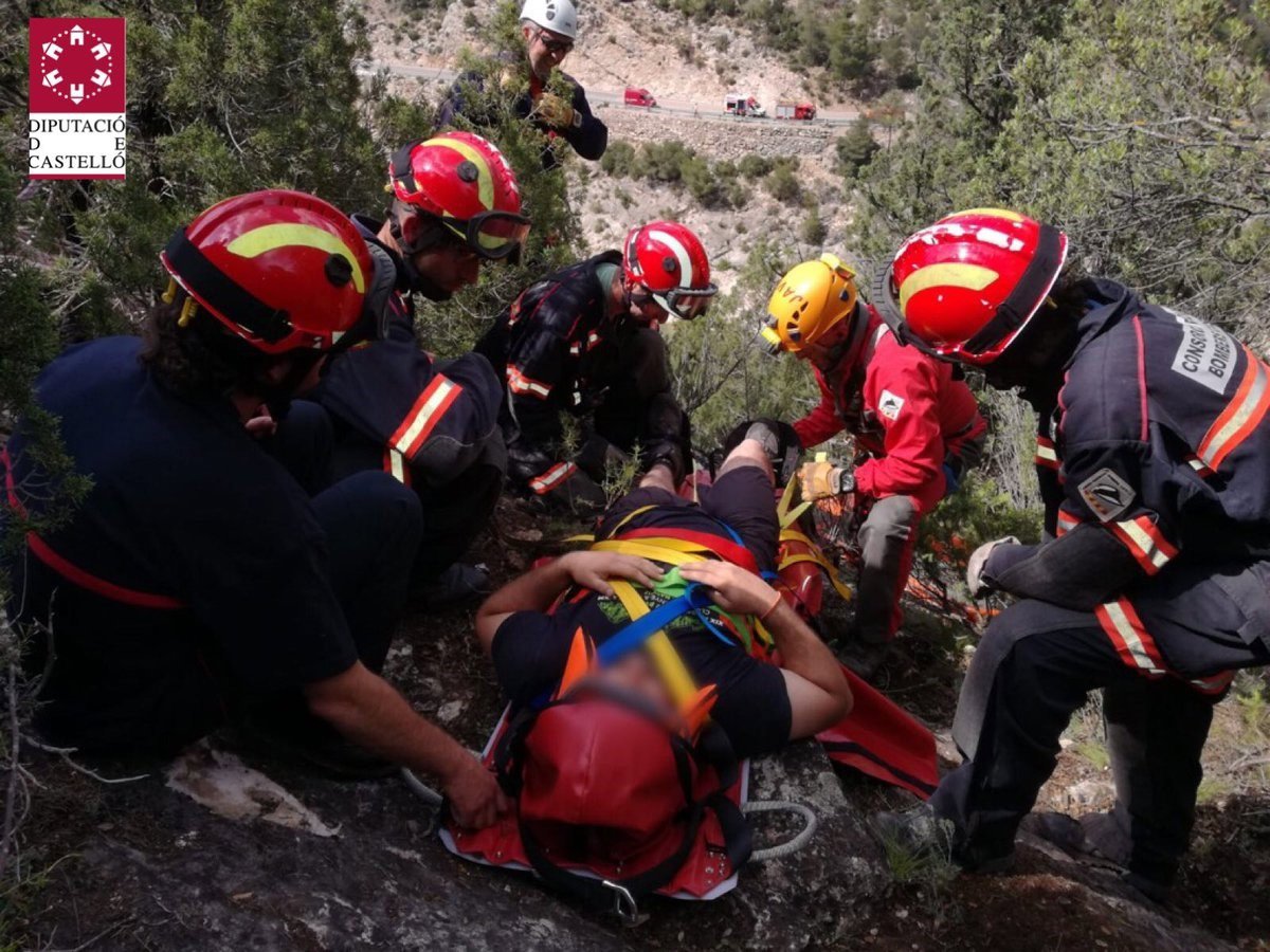 El accidentado se encontraba practicando esta disciplina cuando ha caído desde una altura de 10 metros. Hasta allí se han trasladado bomberos de los parques Els Ports y Baix Maestrat, que ya han preparado al herido en una camilla de rescate para ser evacuado.