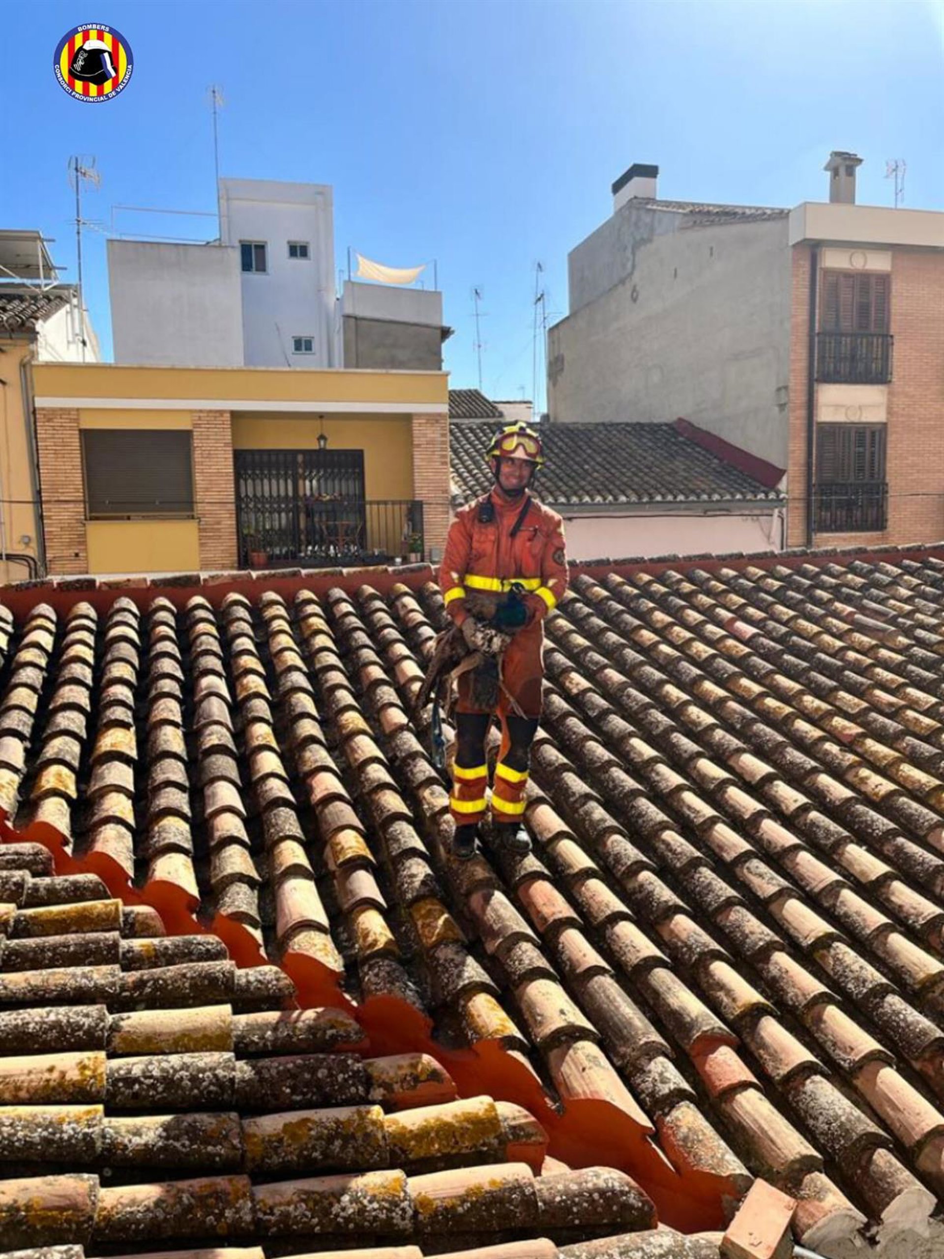 Efectivos de bomberos de los parques de Paterna y Burjassot han rescatado a cuatro pavos reales que iban de tejado en tejado en la localidad valenciana de Godella.